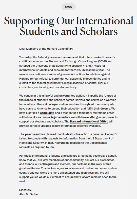 本月22日,美國國土安全部宣布取消哈佛大學(xué)獲得的學(xué)生和交流學(xué)者項目資質(zhì),禁止該校招收國際學(xué)生。23日,哈佛大學(xué)就這一政策起訴特朗普政府。校長加伯當(dāng)天在致哈佛社區(qū)成員的一封信中寫道:“我們譴責(zé)(‘禁招令’)這一非法且不當(dāng)?shù)男袨椤_@一行為危及哈佛大學(xué)數(shù)千名學(xué)生和學(xué)者的未來,也給全美各地高校眾多赴美求學(xué)、追求夢想的學(xué)子敲響了警鐘?!?/p>